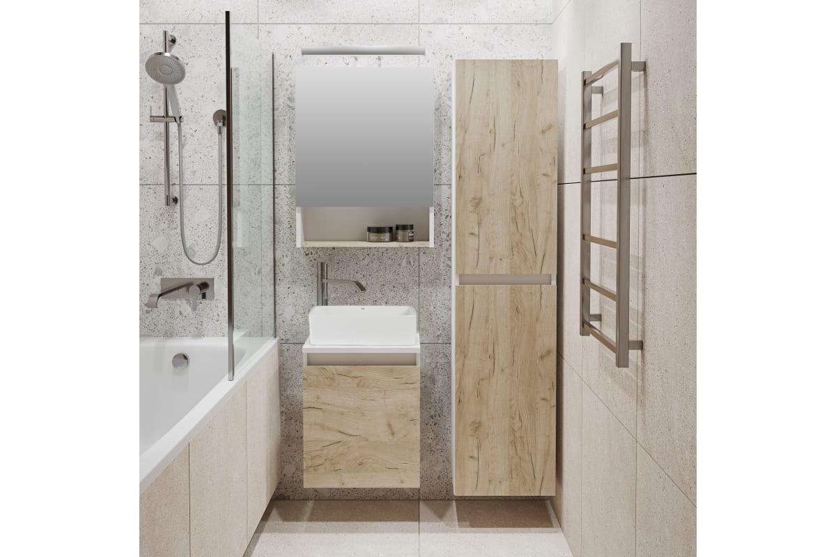 Выполненная в цвете крафтового дуба, тумба придает помещению элегантный и аристократичный вид. Ее компактные размеры (40 см) позволяют рационально использовать даже небольшое пространство, не загромождая интерьер. Распашная дверца с правым открыванием обеспечивает легкий доступ к внутреннему отделению, где можно удобно разместить необходимые ванные принадлежности.