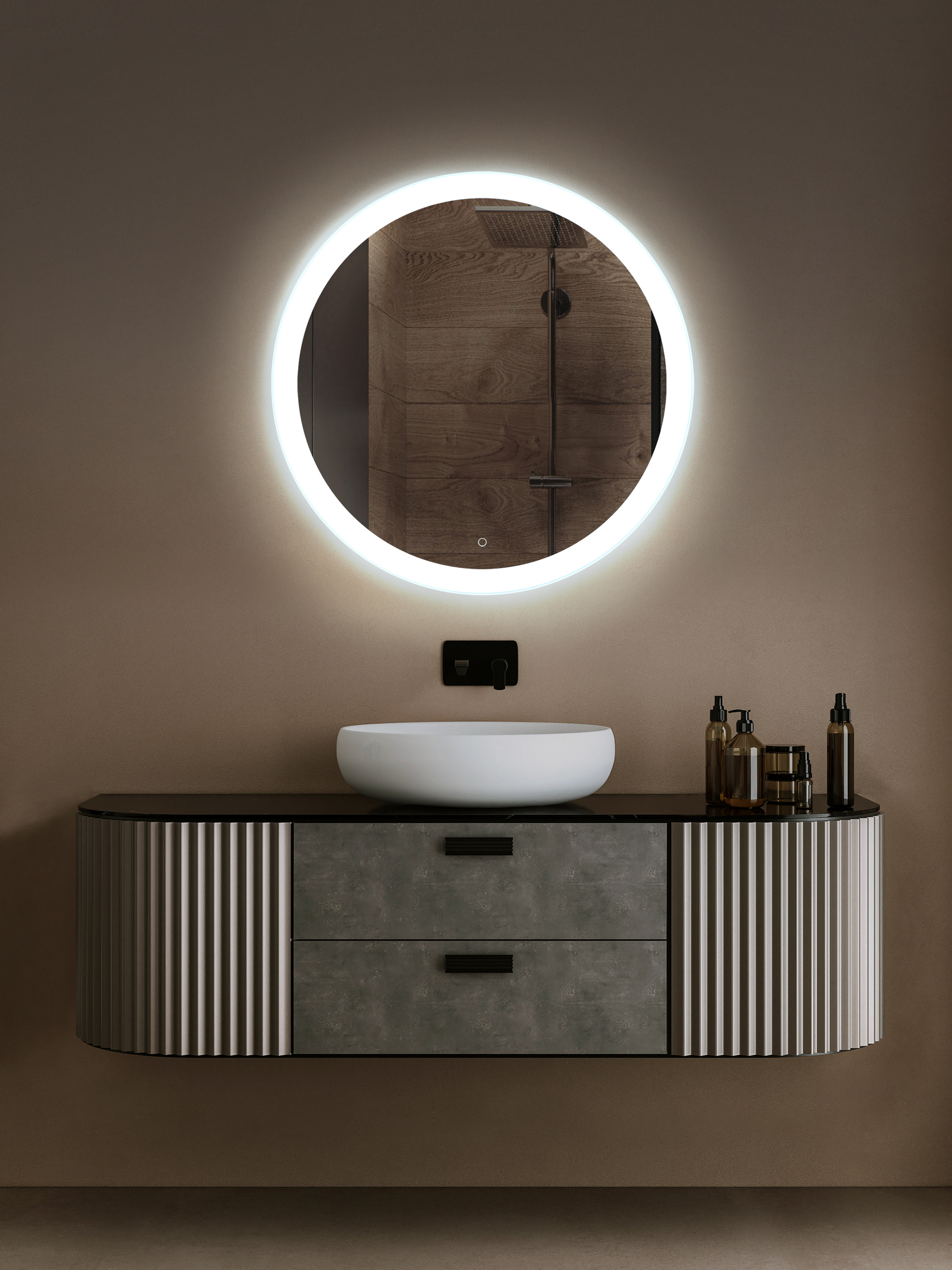 Круглое зеркало с подсветкой — излюбленный дизайнерский приём для создания гармоничного, уютного и нескучного пространства. Идеальная форма круга приятна глазу, смягчает и сглаживает углы. LED-подсветка, регулируемая сенсорным выключателем с функцией диммера, подчёркивает естественность формы зеркала, выделит его на стене и тем самым придаст динамики любому интерьеру: «оживит» строгую классику, добавит выразительности простому, спокойному контемпорари и сдержанному минимализму.